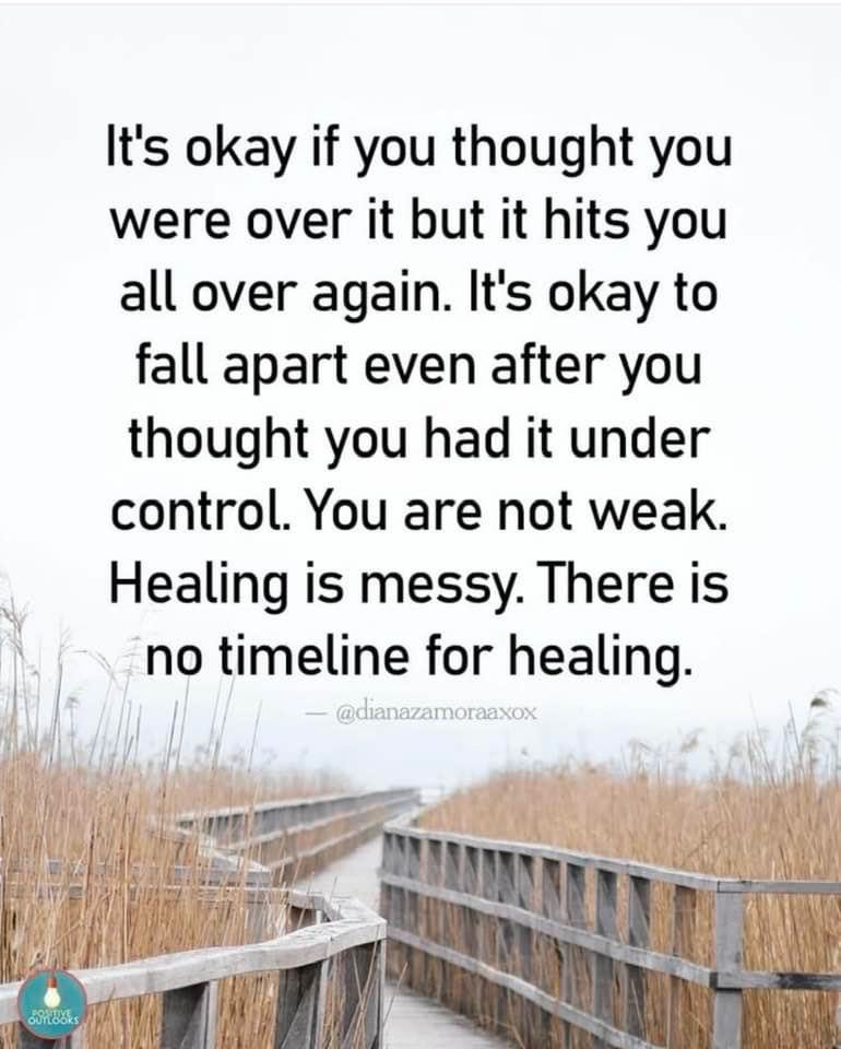These stages are not linear and don’t follow a set timeline. You may bounce between stages, repeat stages, or experience them in a different order altogether. This is entirely normal. Everyone grieves differently, and there is no right or wrong way to experience grief. Remember to be gentle with yourself. As the inset quote states, your emotions can come up at any time and surprise you. It can be triggered by family events, holidays, or just a memory on Facebook. Give the moment just that–a moment, a memory. Feel your emotions and sit with them. Then remind yourself where you are now, and how far you have come.